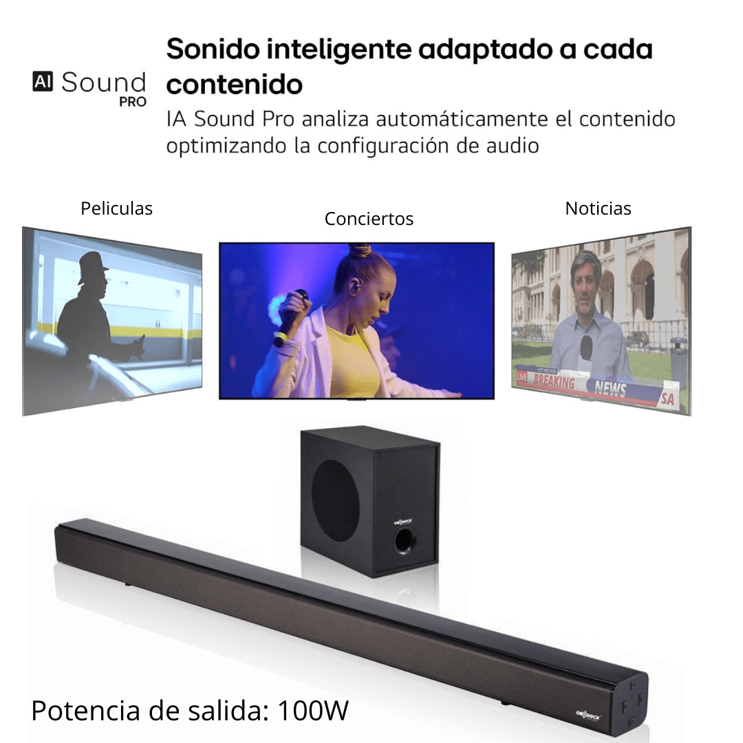 Potencia de salida de 70W – Distribuida entre la barra (4 altavoces de 10W cada uno) y el subwoofer de 30W, ofreciendo un sonido claro con buenos bajos.